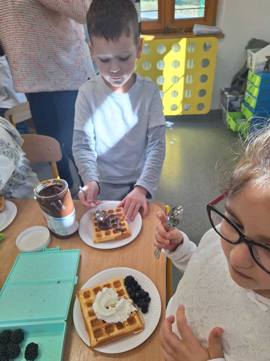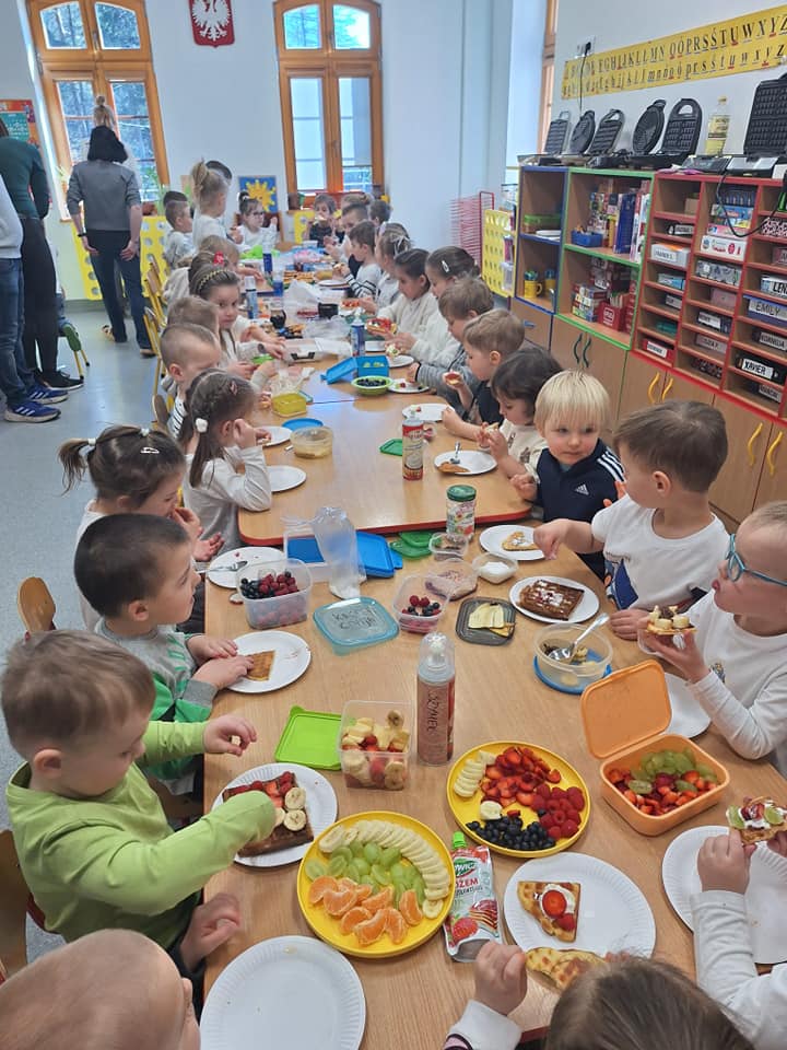 19.03. Maleństwa wraz z Tygryskami obchodziły Międzynarodowy Dzień Gofra. Podczas zajęć dzieci dowiedziały się wielu ciekawostek na temat gofrów. Poznały zasady bezpiecznego korzystania ze sprzętu kuchennego oraz utrwaliły przestrzeganie zasad higieny podczas posiłków i nawyków kulturalnego zachowania się przy stole. Wszystkie dzieci dekorowały i zajadały się pysznymi goframi z bitą śmietaną, dżemem, owocami lub cukrem pudrem. Dziękuję serdecznie po raz kolejny za wizytę rodzicom Wiktorka