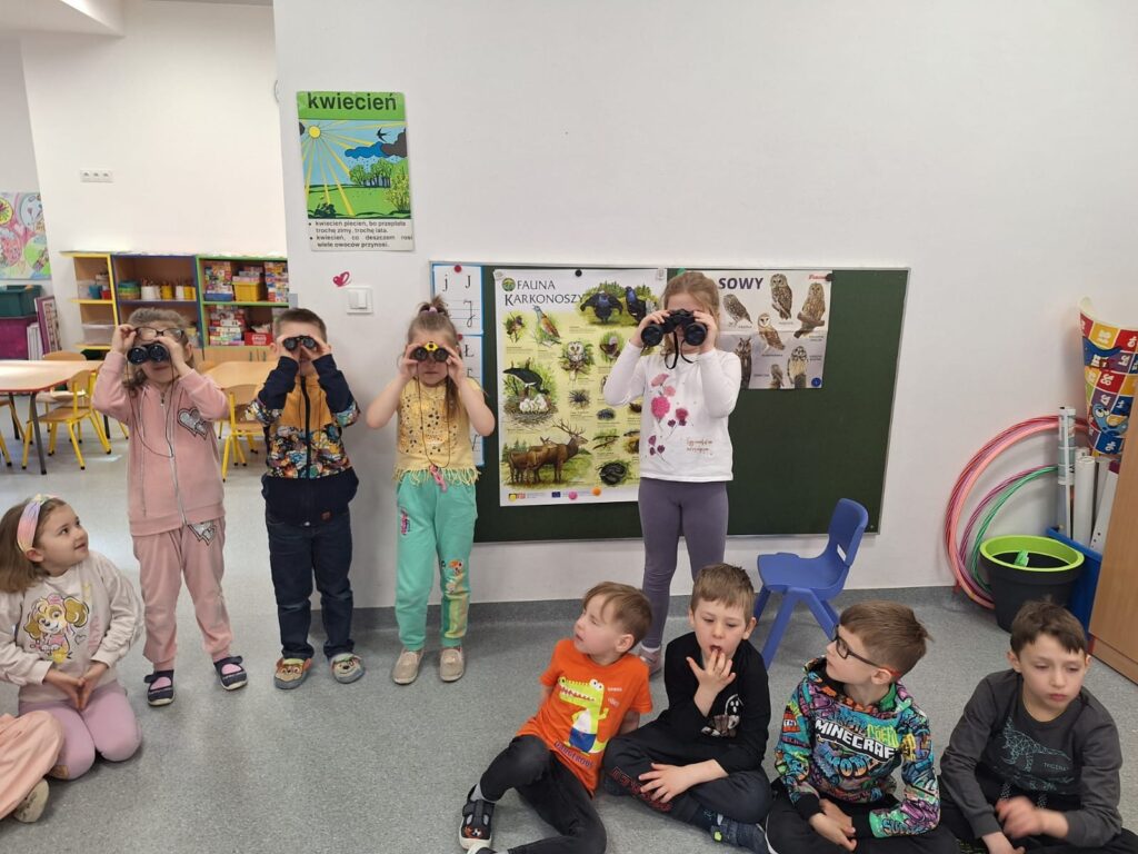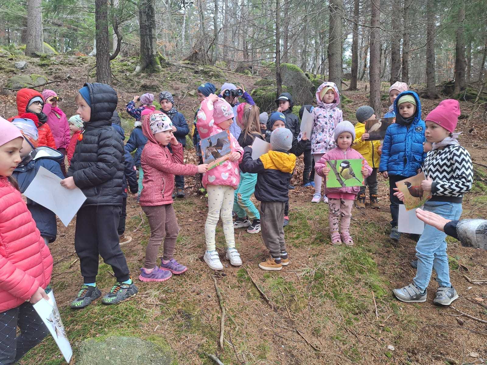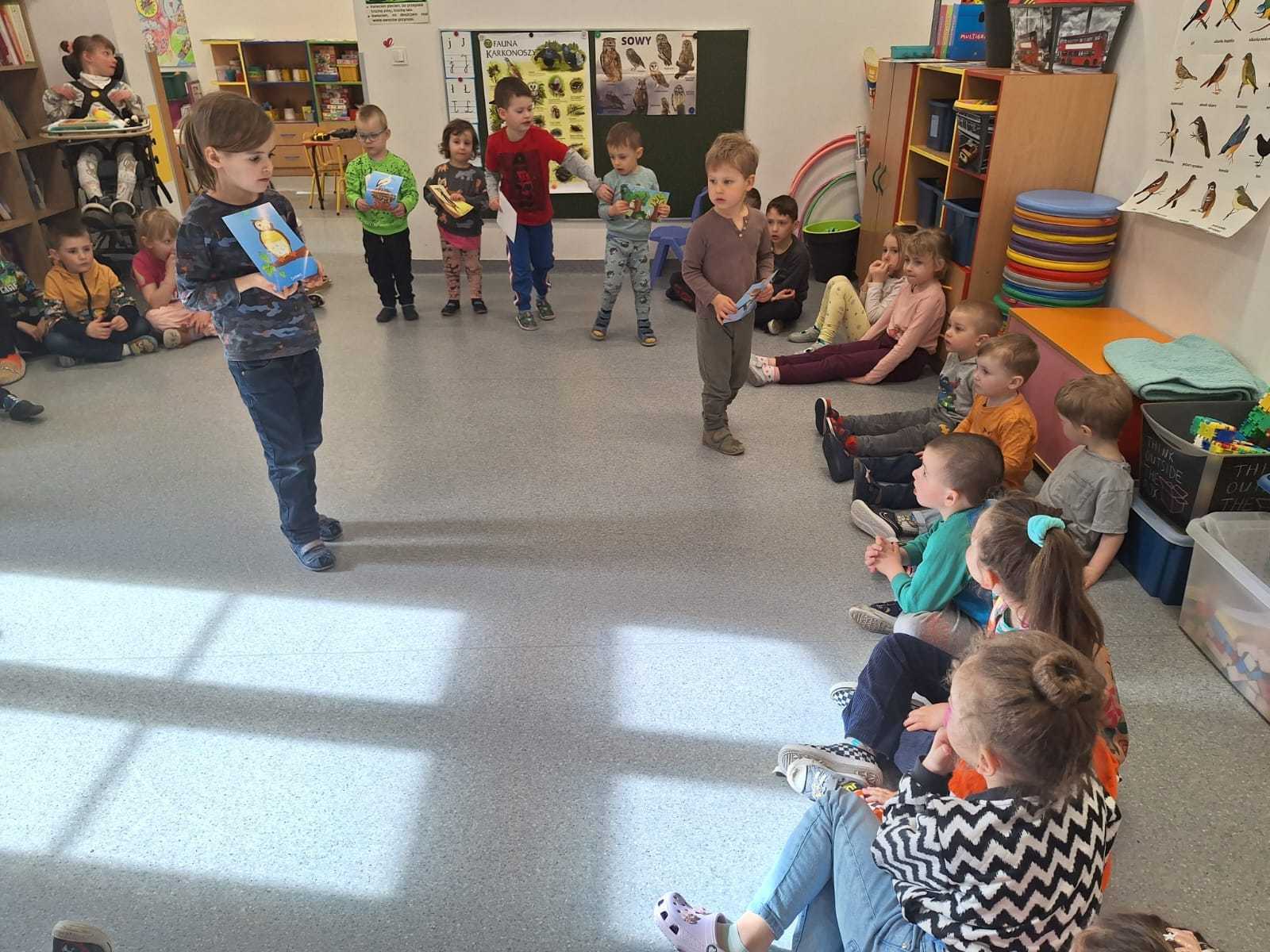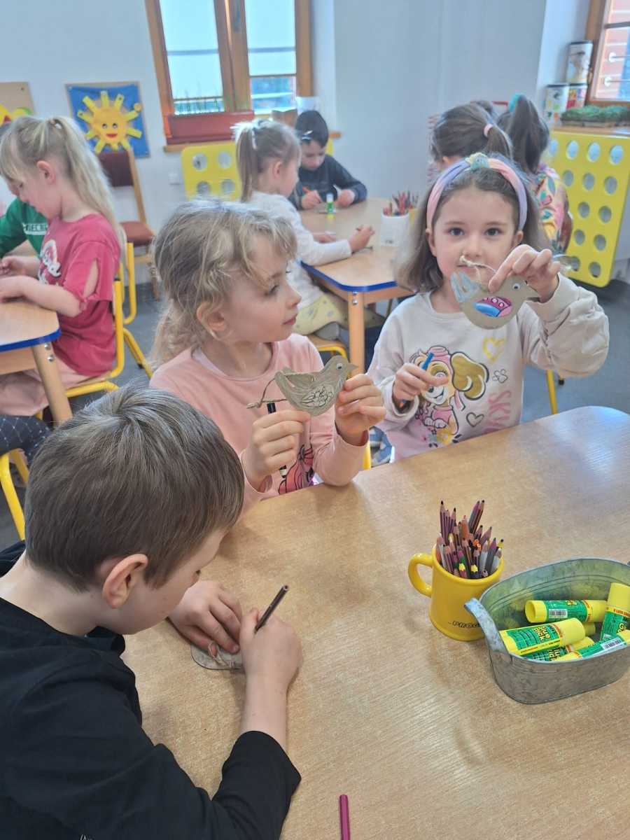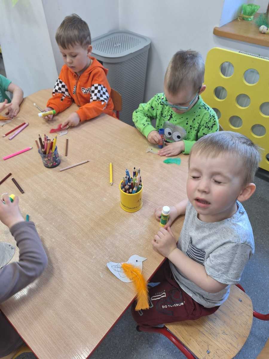 i naśladowały ptasie odgłosy. Poznały zwyczaje popularnych ptaków, takich jak: jaskółka, wróbel, szpak, dzięcioł i kukułka, a także dowiedziały się, które ptaki są najmniejsze na świecie, a które największe. Na koniec dzieci stworzyły swoje własne ptaszki.